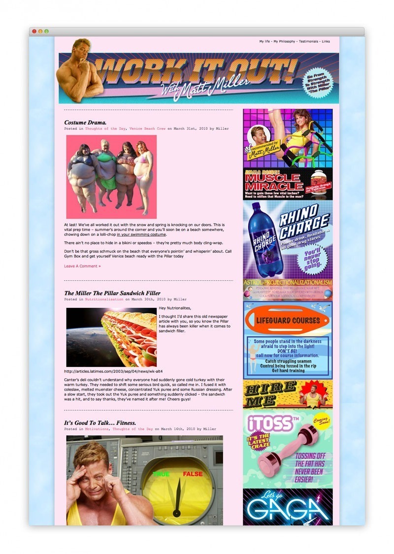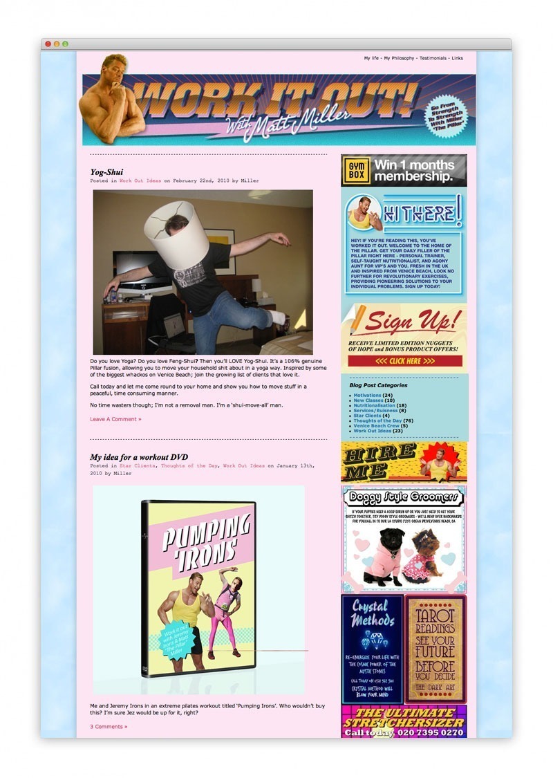This is our rather left field ‘Work It Out’ campaign for Gymbox. We created a larger than life caricature, transforming personal trainer Matthew Miller into ‘Miller the Pillar’ an agony aunt that used off the wall exercise as therapy for his clients. Taking Gymbox’s motto ‘Anything Goes’ and running wild with it, we chose an anti-design home made approach to everything we produced. From the digital aspects like the blog and Facebook page through to all the printed material everything needed to feel slightly lo-fi. This even led to The Pillar getting his own TV show as a result!